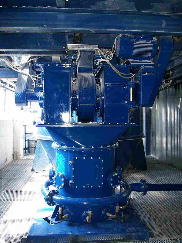Das aus dem System abgeführte Feinmaterial wird kontinuierlich durch Frischmaterial ersetzt. Der für die Mahlleistung entscheidende Mühlenfüllstand wird über Präzisionswägezellen überwacht und automatisch geregelt. Das fertige Mahlgut wird schließlich vom Absaugluftstrom zum Filter transportiert und dort von der Mahlluft getrennt.