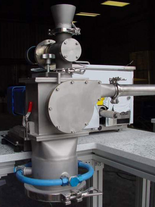 Das Mahlgut wird von oben über eine Eintragstaktschleuse der Gegenstrahlmühle zugeführt. Im Mühlensumpf wird das Material vom Luftstrom der Mahldüsen erfasst und beschleunigt. Dabei prallen die Partikel mit hoher Geschwindigkeit aufeinander und werden durch die Aufprallenergie zerkleinert. Die Mahlung erfolgt autogen, ohne mechanische Mahlwerkzeuge – die Partikel zerkleinern sich selbst.
