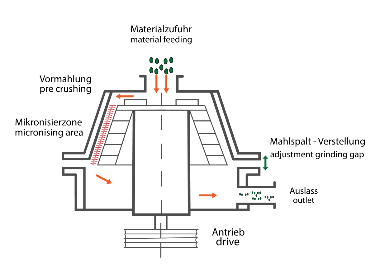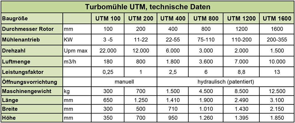Bei der Wirbelstrommühle findet die Zerkleinerung durch eine Kombination von Prallmahleffekten zwischen Partikeln und Mahlbahn und vor allem durch Aufprall Partikel gegen Partikel statt (Strahlmahleffekt). Das Mahlgut wird von oben auf die Wirbelstrommühle dosiert zugeführt und durchläuft dann die mehrstufige Mahlzone der Mühle. Im Unterteil wird das zerkleinerte Material durch den Absaugluftstrom aus der Mühle gefördert. Die Feinheit des Produktes wird durch Verstellen der Drehzahl des Mahlrotors und durch Verstellung des Mahlspaltes zwischen Rotor und Mahlbahn eingestellt. Das Mahlgut wird vom Absaugluftstrom zum Filter transportiert und dort von der Mahlluft getrennt. Optional ist auch eine Fahrweise über Zyklon-Abscheider möglich. Für temperaturempfindliche Produkte (Kunststoffe; Schmelzkleber, Gummi; Gewürze) kann die UTM-Mühle auch als Kaltmahlanlage ausgeführt werden. Durch den einfachen Aufbau der Wirbelstrommühle mit nur einem Antrieb und einer sehr kompakten Mahlkammer ist die Mühle für Wartungs- und Reinigungsarbeiten sehr gut zugänglich. Durch die patentierte Aufklappvorrichtung des Mühlengehäuses kann die Maschine mit wenigen Handgriffen zum Reinigen komplett geöffnet werden. Ein sicherer und schneller Produktwechsel ist somit gewährleistet.