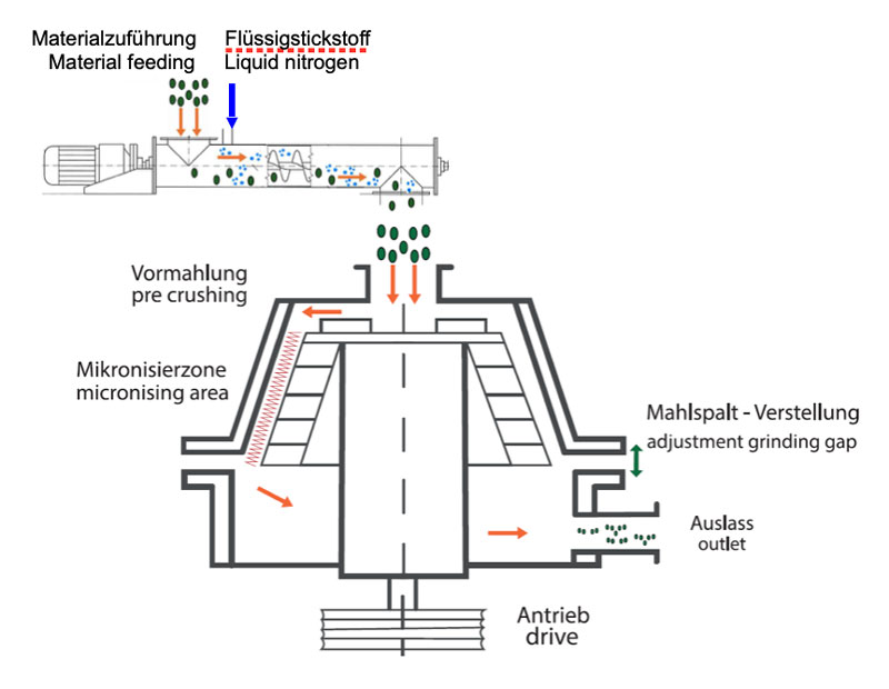 Geeignet für alle Materialien bis Mohs-Härte 3,5. Mit verschleißgeschützter Sonderausführung können auch Materialien mit erhöhtem Quarzgehalt aufbereitet werden. Für temperaturempfindliche Produkte mit Flüssigstickstoffkühlung verfügbar.